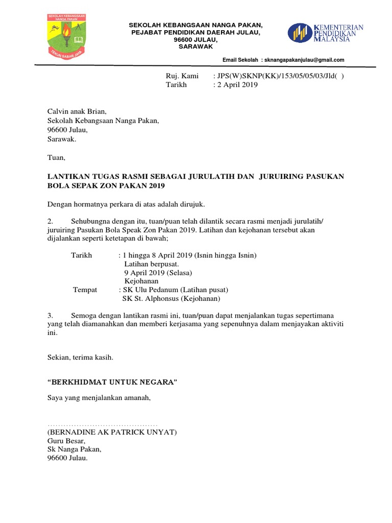 Kejohanan berikut akan diadakan seperti butiran-butiran berikut - Tarikh. Contoh surat dispensasi dari club PERSATUAN SEPAK BOLA. Surat pelantikan sebagai jurulatih bola sepak pasukan sekolah kamu telah.
